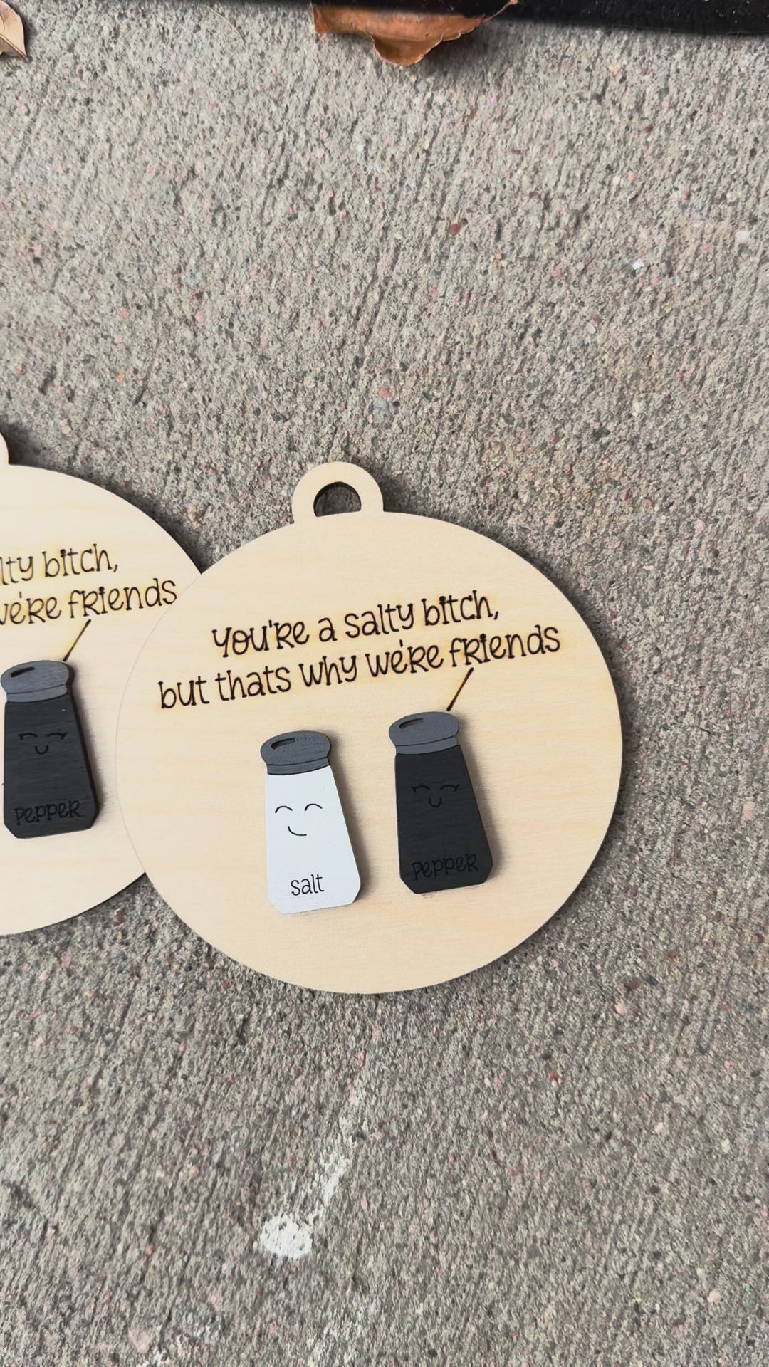 "Embrace your sassy side with the Salty Bitch ornament. This playful piece celebrates your salty attitude and friendship with quirky humor. Perfect for adding a touch of fun to your holiday decor."